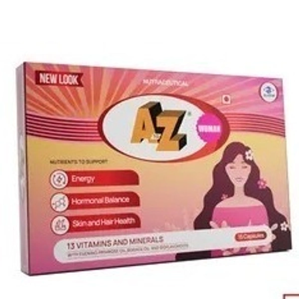 A To Z Woman Capsules are a nutritional supplement designed for women, combining multivitamins, multi-minerals, and natural extracts to improve overall health and address potential deficiencies. Key ingredients include various B vitamins, C, D3, E, K1, biotin, folic acid, iron, zinc, magnesium, selenium, chromium, and natural extracts such as borage seed oil, citrus bioflavonoids, and evening primrose oil. These capsules are used to manage nutritional deficiencies, boost immunity, enhance energy levels, and support various bodily functions.