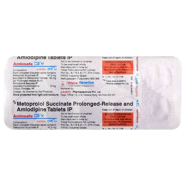 Take control of your heart health with Amlosafe MT 50/5 Mg Tab, a trusted solution designed to help manage blood pressure and promote cardiovascular well-being. Each pack contains 10 tablets, carefully formulated to deliver precision and reliability in every dose.