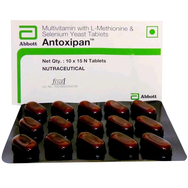 Antoxipan Tablet 15 is used for promoting overall health, managing mild symptoms of conditions such as migraines and irregular heartbeat, and supporting healthy vision. It is formulated with L-methionine, Selenium and essential vitamins and minerals. L-methionine helps detoxify the liver and supports the nervous system, heart and tissue function. Selenium, known for its antioxidant properties, protects the cells from free radical damage. This tablet is beneficial for replenishing nutrients, helping manage deficiencies and promoting overall wellness.