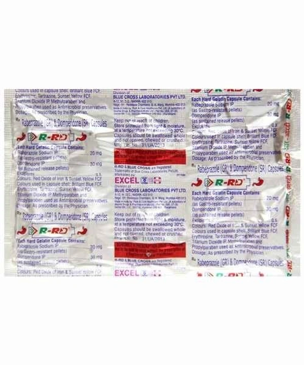 R RD Capsule is a combination medication designed to help with digestive issues caused by excess stomach acid. It contains two active ingredients: Rabeprazole, which reduces acid production in the stomach, and Domperidone, which helps food move more easily through the digestive system. This medicine is commonly prescribed to relieve symptoms like heartburn, nausea, bloating, and stomach pain associated with conditions such as gastroesophageal reflux disease (GERD) and peptic ulcers. By addressing both acid production and digestive movement, R RD offers relief from discomfort and promotes better digestive health.