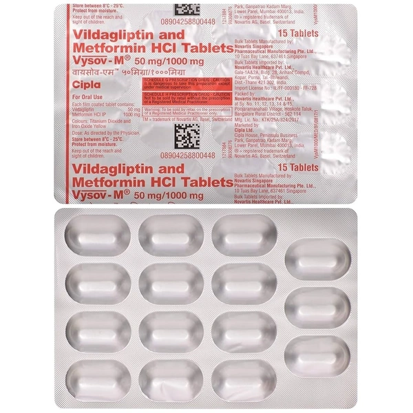 Introducing Vysov M 50/1000Mgtab, a high-quality product from the esteemed brand CIPLA LTD., designed to support effective diabetes management. Each pack contains 15 tablets, combining the power of Vildagliptin and Metformin to help regulate blood sugar levels and improve your overall health.