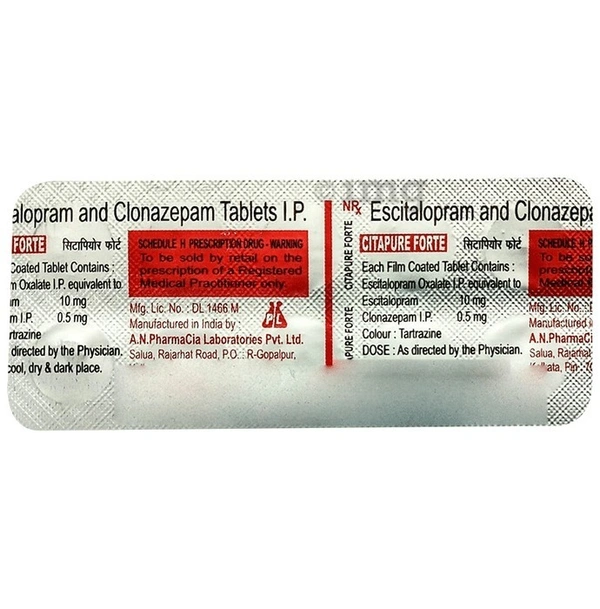 Citapure Forte Tablet helps recover from depression by improving mood and relieving anxiety and tension. It can be taken with or without food. The dose and how often you need it will be decided by your doctor based on the amount needed to control your symptoms. Your doctor may start you on a lower dose and increase it gradually. Do not change the dose or stop taking it without talking to your doctor, even if you feel well. Doing so may make your condition worse or you may suffer from unpleasant withdrawal symptoms such as anxiety, restlessness, palpitations, dizziness, sleep disturbances.