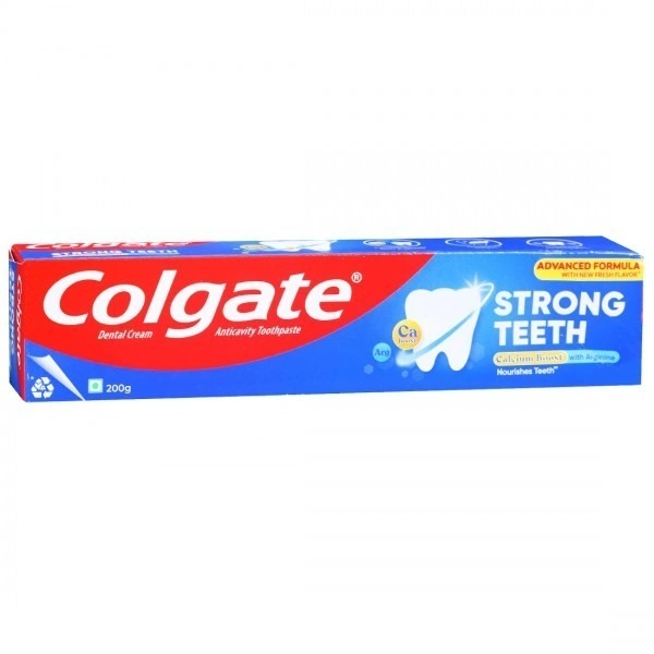 Colgate Strong Teeth Anticavity Toothpaste is a foaming fluoridated toothpaste, which nourishes teeth. It is formulated with calcium boost and arginine, which promotes better teeth remineralization by adding the natural calcium from saliva. It helps by nourishing the teeth, making them two times stronger.