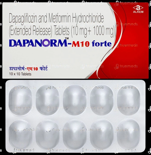 * Salt Composition:Dapanorm M 10 Tablet is composed of two antidiabetic medicines, namely: Metformin and Dapagliflozin. Metformin belongs to the class of biguanides and manages blood sugar levels, particularly in obese patients. It exhibits a nonpancreatic effect to reduce blood glucose levels without increasing insulin secretion.