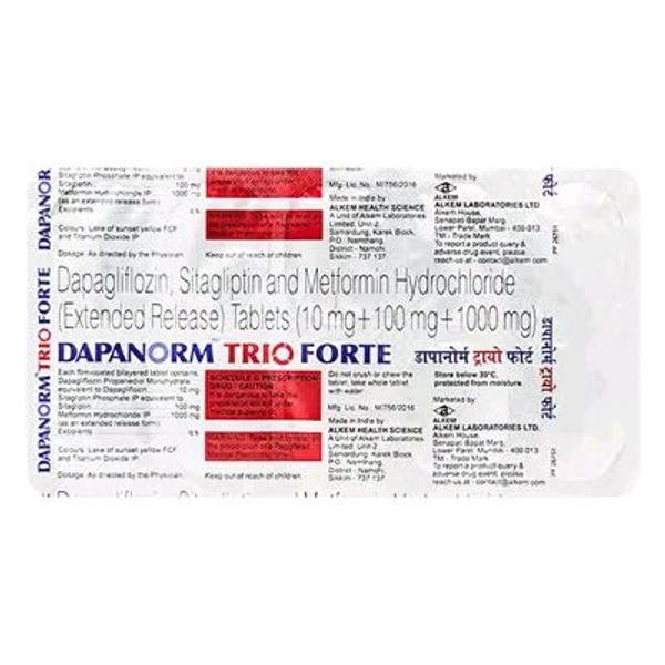* Salt Composition:Dapanorm Trio Forte 10/100/1000 Tablet is a combination of three drugs: Sitagliptin, Dapagliflozin and Metformin. Dapanorm Trio Forte 10/100/1000 Tablet belongs to the group of anti-diabetic medicines used to treat type-2 diabetes mellitus adjunct to diet and exercise.