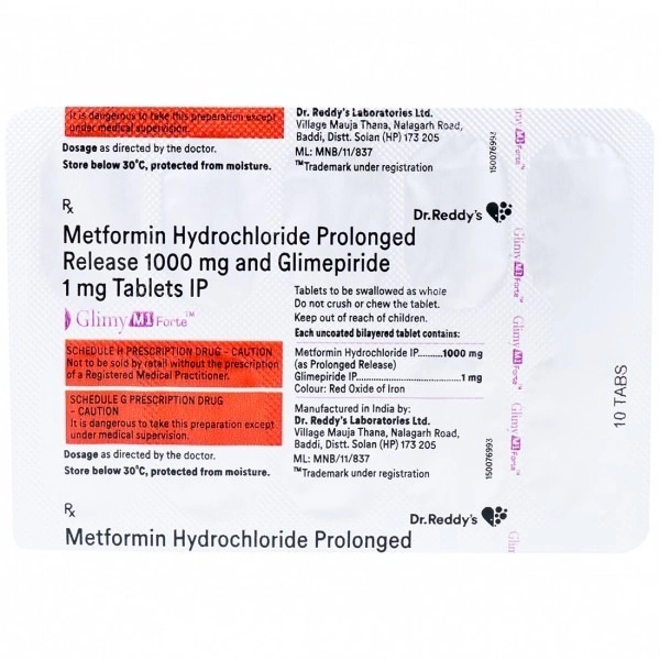 Take charge of your diabetes management with Glimy M1 Forte Tab, a trusted medication designed to help you maintain a healthy blood sugar level. Manufactured by the renowned DR.REDDY'S LAB LTD., this product combines quality, efficacy, and reliability, making it the perfect choice for individuals seeking effective diabetes control.