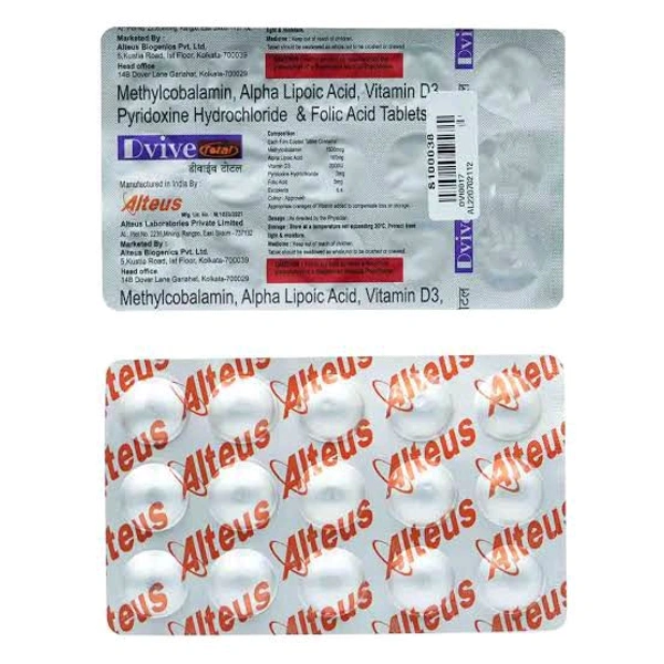 * Product information: Dvive Total Tablet is a nutritional supplement that contains a combination of ingredients aimed at improving general well-being and overall health. The specific composition of Dvive Total Tablet includes mecobalamin, alpha lipoic acid, vitamin D3, folic acid, and pyridoxine. Dvive Total Tablet is commonly used as a nutritional supplement to improve general well-being and overall health. It may also be beneficial for individuals with diabetic neuropathy or those who have deficiencies in the mentioned vitamins.