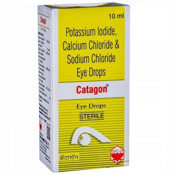 Each Catagon Eye drops contains Potassium Iodine 3.3% w/v, Calcium Chloride Dihydrate 1% w/v, Sodium Chloride 0.83% w/v, Sodium Methyl Hydroxybenzoate equivalent to Methyl Hydroxybenzoate 0.023% w/v (As preservative), Sodium Propyl Hydroxybenzoate equivalent to Propyl Hydroxybenzoate 0.011% w/w (As preservative) In Sterile buffered base q.s.