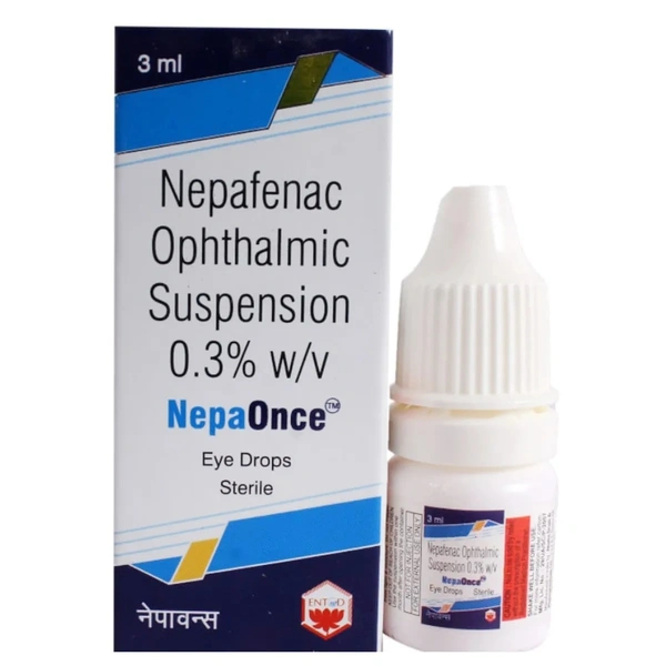 Nepaonce Drop 0.3%, brought to you by ENTOD, is a highly effective ophthalmic solution designed to address multiple eye care needs. Powered by Nepafenac, a proven non-steroidal anti-inflammatory drug (NSAID), this product works as an ophthalmic decongestant, local anesthetic, and anti-inflammatory agent, providing comprehensive care for irritated or inflamed eyes.