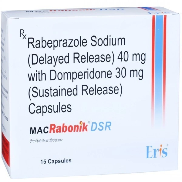 Macrabonik Dsr Capsule is a combination medication designed to help with digestive issues caused by excess stomach acid. It contains two active ingredients: Rabeprazole, which reduces acid production in the stomach, and Domperidone, which helps food move more easily through the digestive system. This medicine is commonly prescribed to relieve symptoms like heartburn, nausea, bloating, and stomach pain associated with conditions such as gastroesophageal reflux disease (GERD) and peptic ulcers. By addressing both acid production and digestive movement, Macrabonik Dsr offers relief from discomfort and promotes better digestive health.