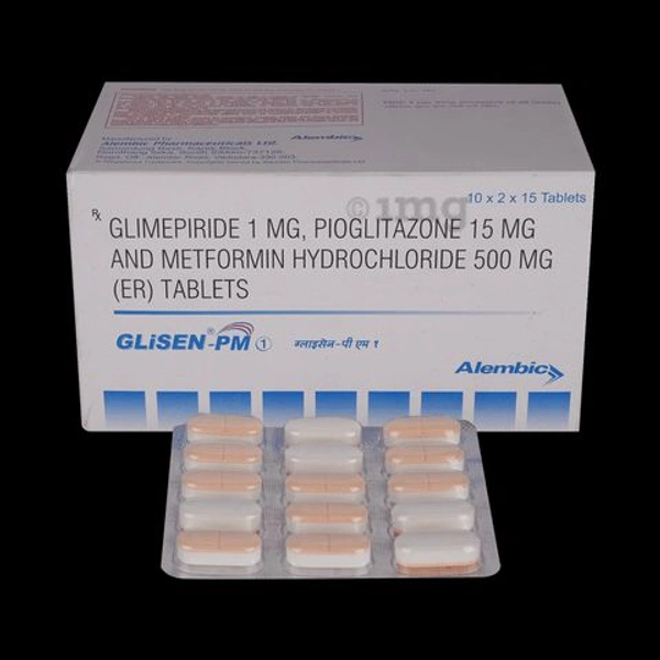 * Product information: Glisen-PM 1mg/500mg/15mg Tablet is a combination medicine that helps control blood sugar levels. This medicine is used together with diet and exercise to improve blood sugar control in adults with type 2 diabetes mellitus. It helps in proper utilisation of insulin, thereby lowering the blood sugar levels.
