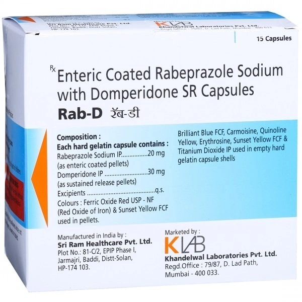Rab D Capsule is a combination medication designed to help with digestive issues caused by excess stomach acid. It contains two active ingredients: Rabeprazole, which reduces acid production in the stomach, and Domperidone, which helps food move more easily through the digestive system. This medicine is commonly prescribed to relieve symptoms like heartburn, nausea, bloating, and stomach pain associated with conditions such as gastroesophageal reflux disease (GERD) and peptic ulcers. By addressing both acid production and digestive movement, Rab D offers relief from discomfort and promotes better digestive health.