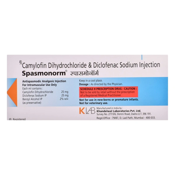 Spasmonorm Inj (2 Ml) is a trusted solution for alleviating pain and spasms. With a powerful combination of Camylofin (25mg) and Diclofenac (25mg), this injection is designed to provide rapid and effective relief for various conditions where pain and muscle spasms occur. Manufactured by the reputed KHANDELWAL LAB. LTD., this product offers high-quality care tailored to your specific needs.