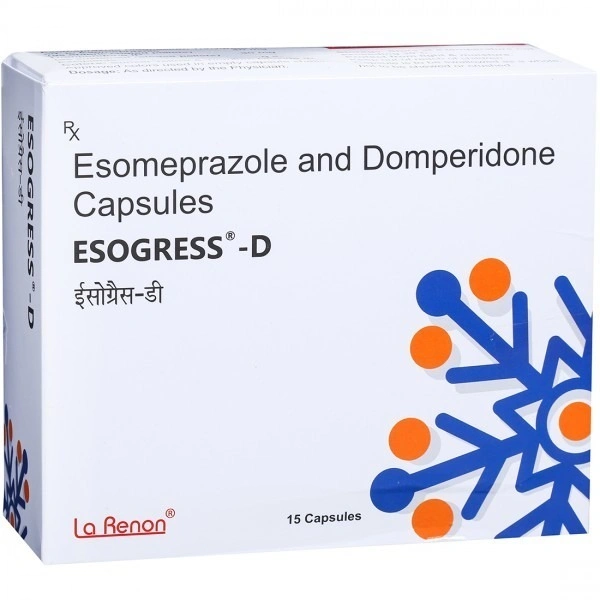 Gastroesophageal reflux disease occurs when stomach acid flows back into the food pipe, leading to heartburn and possible esophageal injury. Esogress D Capsule is composed of two main ingredients: Esomeprazole and Domperidone. Esomeprazole reduces stomach acid production, while Domperidone helps improve stomach movement and prevents nausea. Together, they effectively relieve post-prandial symptoms of fullness, bloating, nausea, indigestion, heartburn, stomach pain, peptic ulcers, and other symptoms caused by hyper-acidity.