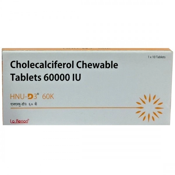 Hnu D3 60K Chewable Tablet is a medicine contains Vitamin D3 (Cholecalciferol), used to address vitamin D deficiency, especially when dietary intake is insufficient to meet the body’s vitamin D requirements. A lack of vitamin D can lead to bone disorders like softening and weakening of bones (rickets, osteomalacia), bone thinning (osteoporosis) and long-term vitamin D deficiency may lead bone loss, muscle weakness, and an increased risk of fractures in older individuals. Hnu D3 60K Chewable Tablet enhances the absorption of calcium and phosphate in the intestines, helping to prevent various bone disorders while promoting healthy bones, muscles, and nerves. Additionally, Hnu D3 60K Chewable Tablet aids in treating conditions like hypoparathyroidism and hypophosphatemia and supports immune system function.