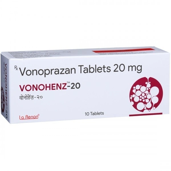 Vonohenz 20 Tablet is a medicine, used to reduce the stomach acid production and effectively treats conditions like stomach ulcers, pain from acid reflux, and other conditions caused by high acidity. Vonohenz 20 Tablet helps to relief heartburn associated with erosive esophagitis (inflammation in your esophagus) in adults. Additionally, Vonohenz 20 Tablet prevents the recurrence of stomach and duodenal ulcers when taking aspirin or other anti-inflammatory drugs (NSAIDs). Vonohenz 20 Tablet may also be prescribed alongside other medications to treat Helicobacter pylori bacterial infection.