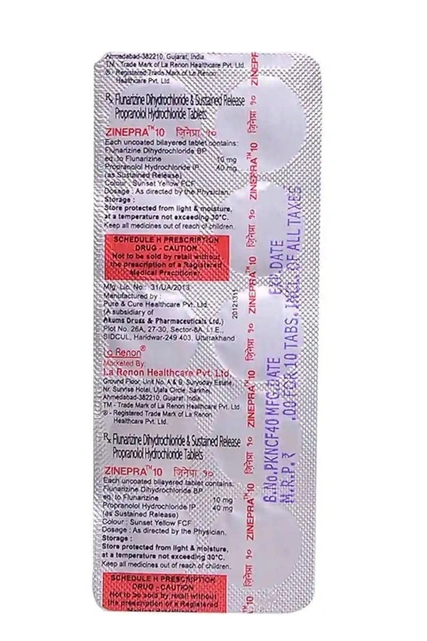 Take charge of your cardiovascular health with Zinepra 10Mgtab, a scientifically formulated fixed-dose combination of Propranolol (a non-selective beta blocker) and Flunarizine (a calcium channel blocker). This powerful combination is specially designed to support the treatment of cardiovascular diseases and hypertension, helping you maintain a healthier, more balanced lifestyle.