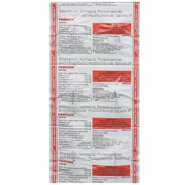 Forecox Tab 6'S is a powerful and reliable combination therapy formulated specifically to address tuberculosis. Each tablet packs a potent blend of Ethambutol 400mg, Isoniazid 150mg, Pyrazinamide 750mg, and Rifampicin 225mg, designed to work synergistically for maximum efficacy. Manufactured by the trusted MACLEODS PHARMACEUTICALS, this product is a cornerstone in tuberculosis management, recommended by healthcare professionals worldwide.