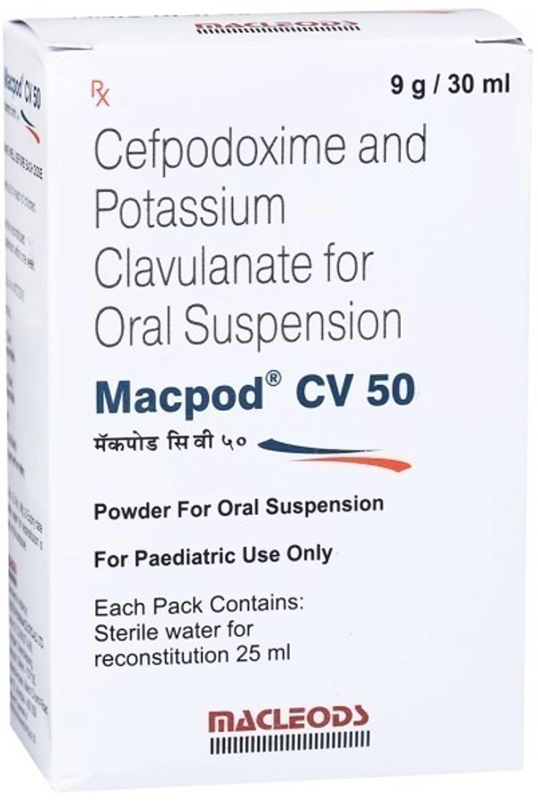 Macpod CV 50 Syrup is a premium-quality, doctor-recommended pediatric formulation designed to provide effective relief from bacterial infections. Manufactured by the trusted brand MACLEODS PHARMACEUTICALS, this syrup is a combination of Cefpodoxime 50mg/5ml and Clavulanic Acid 31.25mg/5ml, ensuring a double-action approach to combat harmful bacteria while offering lasting protection. It is the perfect solution for parents seeking reliable and safe treatment for their children.