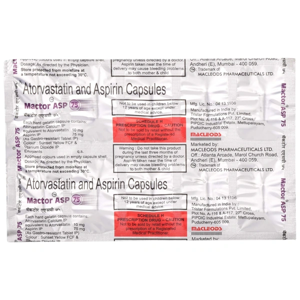 Take charge of your health with Mactor Asp 75Mgcap, a specialized combination of Aspirin and Atorvastatin. Designed to support cardiovascular health, this medication helps reduce the risk of heart-related complications while managing cholesterol levels effectively. Manufactured by the reputable MACLEODS PHARMACEUTICALS, it is trusted by healthcare professionals and patients alike for its proven efficacy.