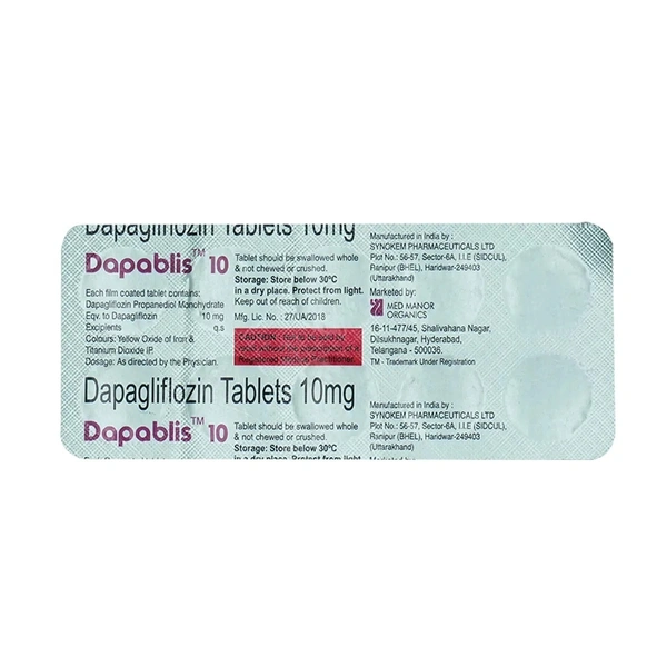 Dapablis 10 Tablet is a prescription medicine that contains dapagliflozin as its main ingredient. It belongs to a group of drugs called SGLT2 inhibitors, which help manage high blood sugar levels in people with type 2 diabetes when combined with a healthy diet and regular physical activity. Beyond diabetes control, this tablet can also support heart health by lowering the chances of hospital stays due to heart failure in those with existing heart risks or conditions. Additionally, it aids in protecting kidney function by slowing down the worsening of chronic kidney disease, reducing the need for dialysis or the risk of related heart problems. It's important to note that this medication is not suitable for type 1 diabetes or for those with severe kidney issues, and it should only be used under a doctor's guidance to monitor its effects.