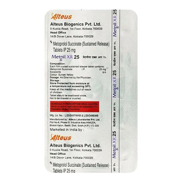 * Product information: Metpil XR 25 Tablet belongs to a group of medicines called beta-blockers. It is used to treat high blood pressure (hypertension), angina (heart-related chest pain), and irregular heart rhythms (arrhythmia). It also helps prevent migraines, future heart attacks, and strokes.