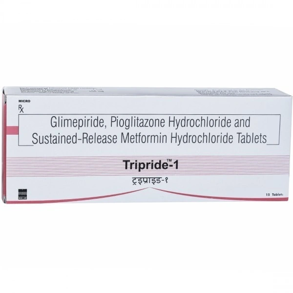 Each Uncoated bilayered Tripride 1 mg tablet contains Glimepiride 1 mg, Pioglitazone Hydrochloride equivalent to Pioglitazone 15 mg, Metformin Hydrochloride 500 mg (In Sustained-release form).