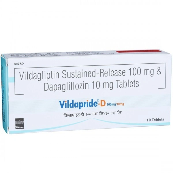 Take charge of your diabetes care with Vildapride D 10/100Mgtab, a powerful combination of Dapagliflozin (10mg) and Vildagliptin (100mg). This innovative formulation is designed to help regulate blood sugar levels effectively and improve overall glycemic control. Backed by the trusted expertise of MICRO LABS, this product is tailored to support your journey toward better health.