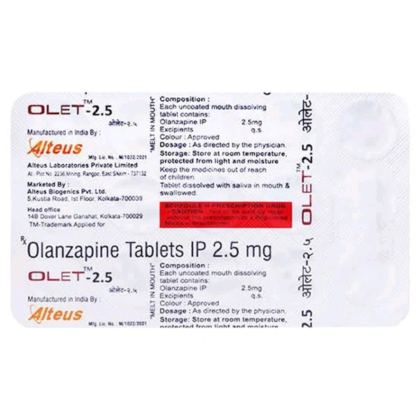 * Product information:Olet 2.5 Tablet MD is used in the treatment of schizophrenia (a mental disorder that can result in hallucinations or delusions and also adversely affects a person’s ability to think and behave) and mania.