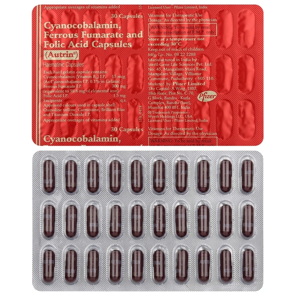 Boost your health and vitality with Autrin Cap, a premium supplement meticulously crafted to support your daily nutritional needs. Packed with essential ingredients like Cyanocobalamin (15mcg), Ferrous Fumarate (300mg), and Folic Acid (1.5mg), this formula is designed to promote optimal energy levels, enhance red blood cell production, and support overall well-being.