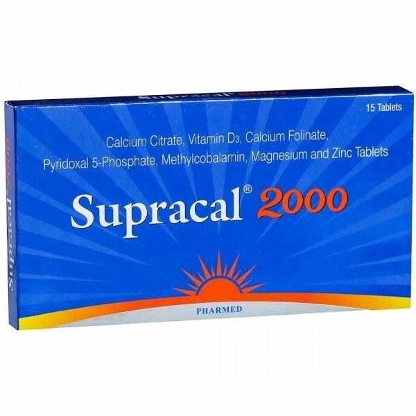 Supracal 2000 Tablet is a combination of calcium citrate, vitamin D3, calcium folinate, pyridoxal-5-phosphate, methylcobalamin, magnesium, and zinc advised for therapeutic use only.