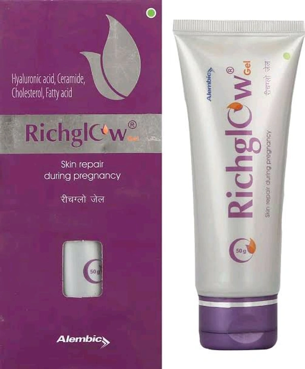 * Product information: Richglow Gel is a unique combination of hyaluronic acid, ceramide and fatty acids used to repair skin during pregnancy. It nourishes and moisturizes the skin and keeps it soft and supple. Also it helps the skin to get rid of the stretch marks that occur during pregnancy.