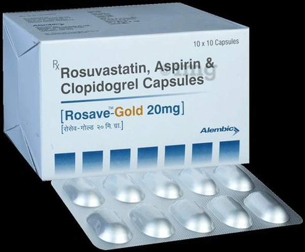 * Product information: Rosave-Gold 20mg Capsule is used for prevention of heart attack, stroke and treatment of peripheral vascular disease. It is a combination of medicines that prevent clot formation in the blood vessels. It also helps to reduce increased cholesterol and triglycerides levels.