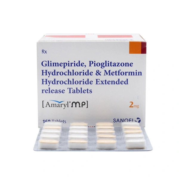 Take control of your diabetes management with Amaryl MP 2 mg Tablet, a powerful combination of three effective medications: Glimepiride, Pioglitazone, and Metformin Hydrochloride (extended release). Designed specifically for individuals with type 2 diabetes mellitus, this bilayered, uncoated tablet offers a comprehensive approach to managing blood sugar levels.