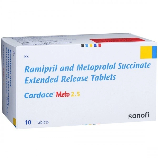 Take control of your heart health with Cardace Meto 2.5Mgtab, a trusted solution developed with precision and care. Each tablet combines the power of Ramipril (2.5 mg) and Metoprolol Succinate (23.75 mg) (equivalent to Metoprolol Tartrate 25 mg) in an extended-release formula, designed to provide effective and sustained support for managing hypertension and cardiovascular health.